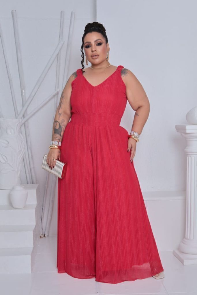 O Macacão Virginia Plus Size é sinônimo de elegância moderna com muito conforto. Produzido em tule com fio de lurex, ele traz um brilho sofisticado que valoriza o visual sem exageros. Sua modelagem foi pensada para quem veste do 50 ao 54, proporcionando caimento perfeito, realçando as curvas e oferecendo liberdade nos movimentos.