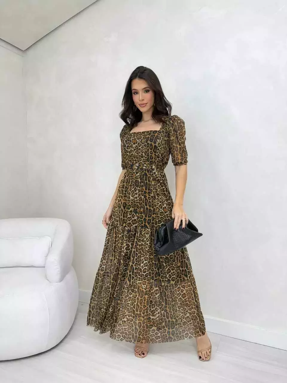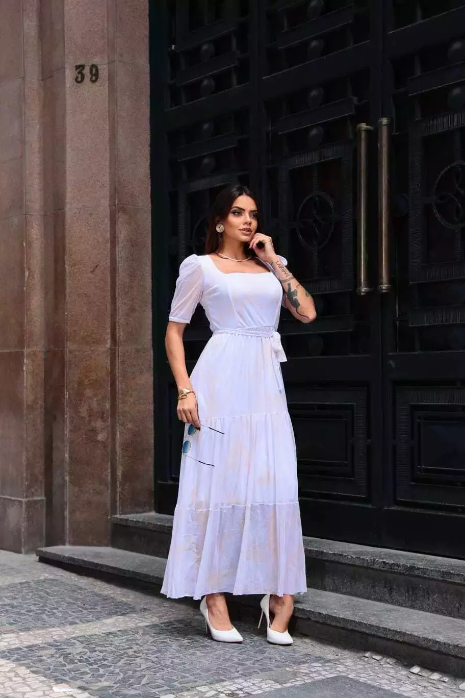 Confeccionado em tecido tule forrado, ele garante leveza e segurança ao vestir. A gola quadrada traz um toque moderno e feminino, enquanto o cinto no mesmo tecido marca a cintura com sutileza.